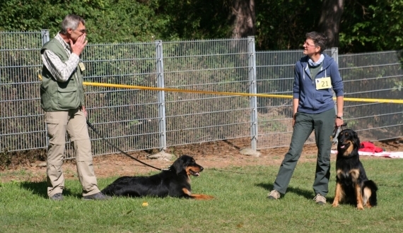 Die Körmeisterin Margit Bothur honorierte Nalas sicheres und unerschrockenes Verhalten beim Sprung über das Hindernis, beim Gang über die Plane, bei Begegnungen mit Einzelpersonen oder Personengruppen mit und ohne Leine, bei der Bewachung der Hundeführer-Jacke, beim sicheren Gebrauch der Nase zum Auffinden der versteckten Wurst-Stückchen, beim Spielen mit dem fremden Helfer und bei der Untersuchung. Auch die uneingeschränkte Schuss-Sicherheit hat Nala wieder bewiesen.