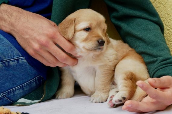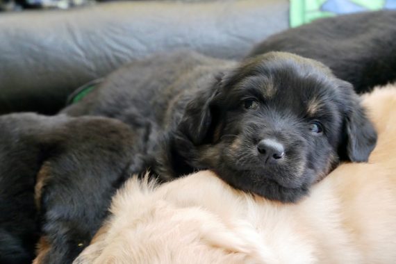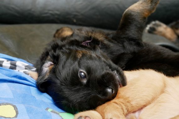 Denn jetzt reagieren die Welpen auf akustische Reize und auf Personen, die sich ihnen nähern. Sie freuen sich, kommen tollpatschig auf einen zugerannt, manchmal unternehmen sie auch den Versuch auf einen loszuspringen :), die Rute wedelt kräftig und gerne spielen sie mit unseren Händen, Füßen oder den gegebenen Kuscheltieren.