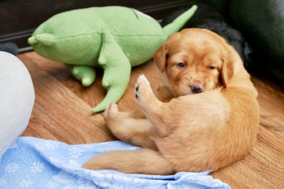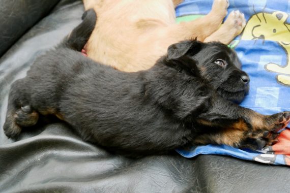 Nur Mama Nala schleppt eigentlich immer alle Kuscheltiere heraus; ihrer Meinung nach gehören die nicht zu den Welpen!!! Da müssen wir noch einiges an Überzeugnungsarbeit leisten, denn die Welpen freuen sich über die Tierchen, die man wie Beute schon schütteln kann und in deren Ohren man beißen kann, ohne dass das „Opfer“ ungeduldig wird wie die Geschwisterchen bei solchen Attacken…