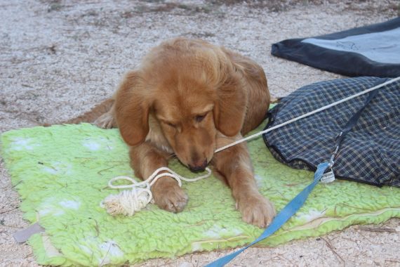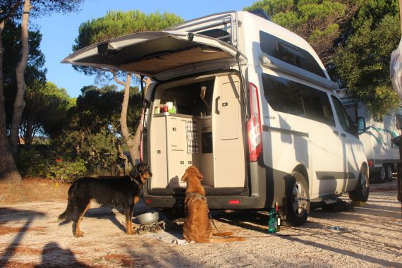 Bolle hat sich dank Nalas großartigem Vorbild ganz schnell in die Campingplatz-Rhythmen und -Regeln eingefunden. So haben beide gerne am „Küchenzugang“ auf die Bereitstellung ihres Fressens gewartet.