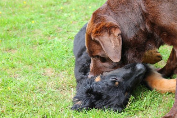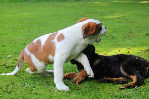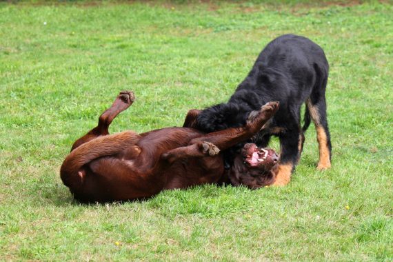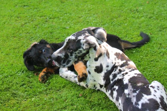 Mit Hausfreund Jones läuft es mittlerweile auch hervorragend! Wenn der wieselige Schwarze mal wieder zu aufdringlich und stürmisch ist, gibt es zwar logischerweise immer noch lautstarke Ansagen (vor allem drinnen), aber meist versteht Bootsmann die Botschaft schnell oder wir erinnern ihn nochmal an die Umgangsformen bei uns. Ansonsten ist täglich Play-Time angesagt. Egal ob unterwegs, oder im Garten. Dabei geht es zum Teil ordentlich zur Sache (siehe Beweisfotos), so dass man Herr B. auch schon mal bremsen muss, weil Jones sich für unseren Geschmack etwas zu viel gefallen lässt. Daher schützen wir ihn einfach vor sich selbst, wenn es zu kernig wird.