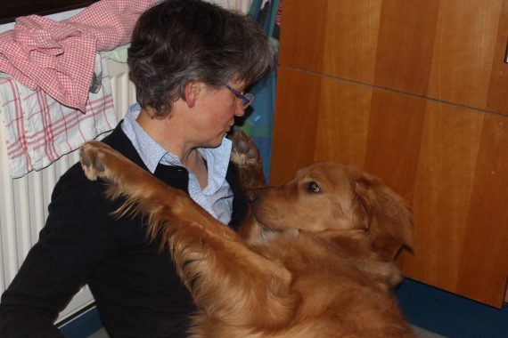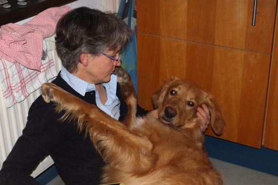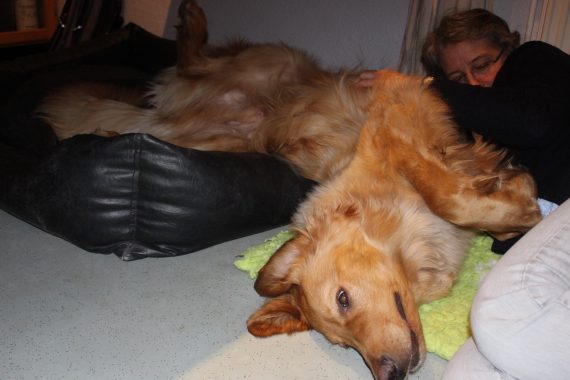 Und wenn sich jemand auf den Boden begibt, dann ist das Baby Bolle ganz schnell zum Kuscheln da. Er schmeißt sich in die Arme / auf den Schoß und dann geht das Kuscheln los und hört so schnell nicht wieder auf – das (Hunde-) Leben ist schön!