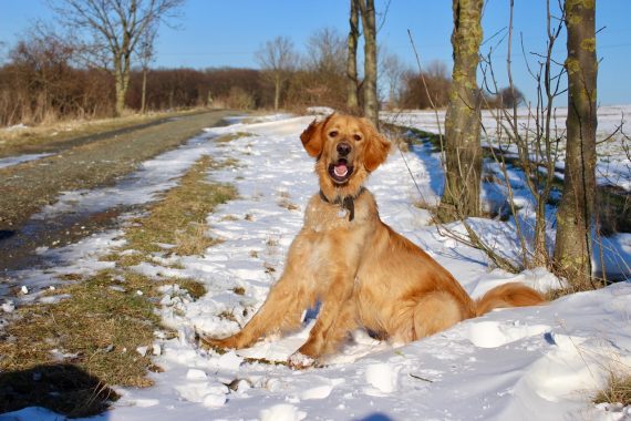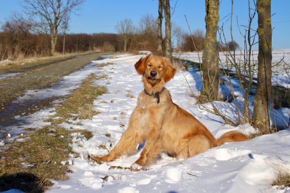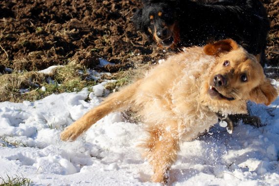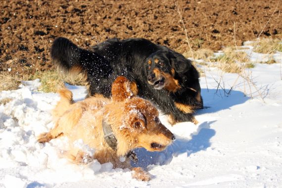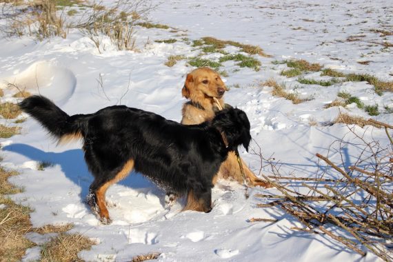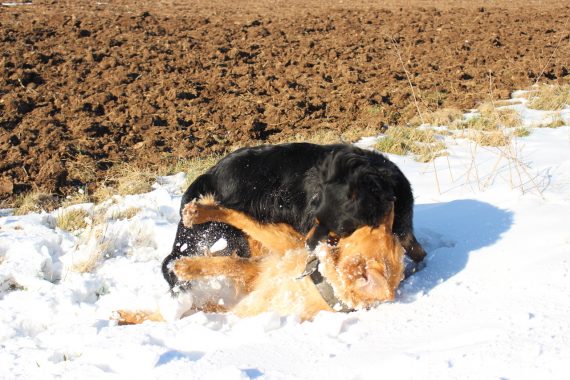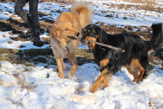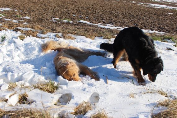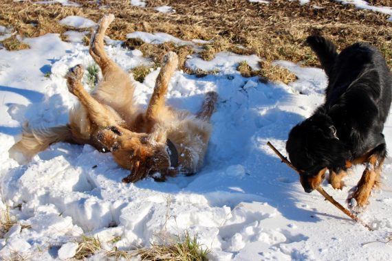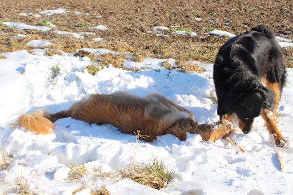 Bolle hat den Schneegraben dann auch gerne zum Schnee-Bad genutzt und sich ganz nebenher immer näher an Nala mit dem Stock herangerollt. Schließlich hat er dann auch ein Stückchen vom dann bereits zerlegten Stock abbekommen.
