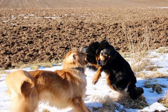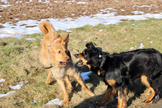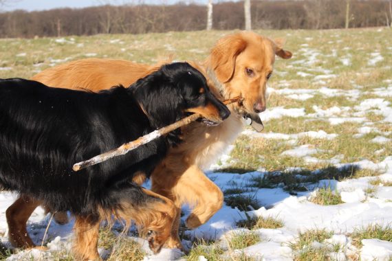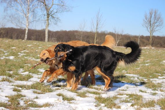 Beim Spazierengehen ist oft Lauf-Aktion angesagt. Entweder Bolle oder Nala fordern auf – und dann geht das Verfolgungsrennen los! Wenn dazu noch ein Stöckchen zur Verfügung steht, wird eben im Gleichschritt marschiert und so schnell gibt keiner auf 🙂