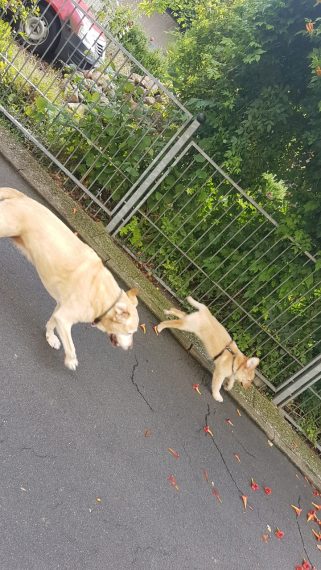 Nun empfängt sie auch wedelnd unsere Gäste und hat schon einige Artgenossen kennengelernt. Der Nachbarlabrador ist ihr Freund geworden und er hat ihr gezeigt, dass Straßen mit Autos harmlos sind und man cool dort entlanglaufen kann. Generell startet sie bei anderen Hunden sehr schüchtern, dreht dann ordentlich auf und sucht sich dann flott einen Busch zum verstecken, wenn es einen Rüffel vom Gegenüber gibt.