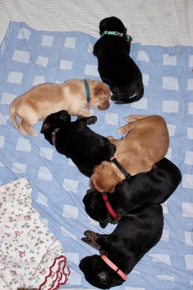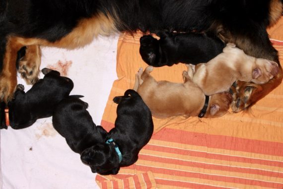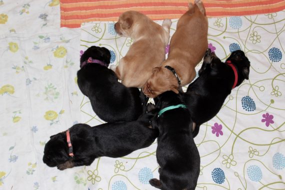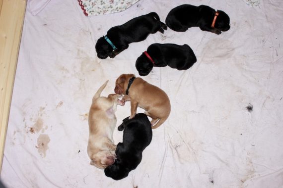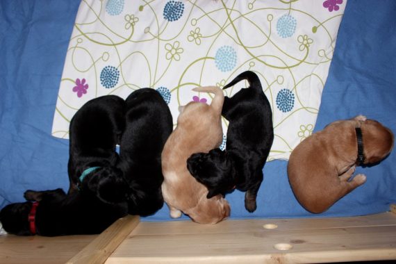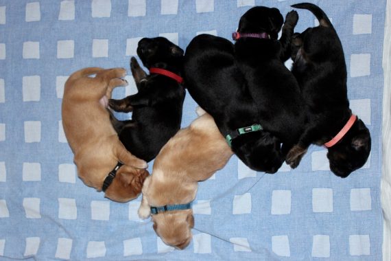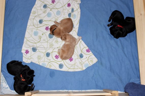 Mit Schlafen und Trinken geht’s uns prächtig! Gerne präsentieren wir auch unsere Stimmen, die den Mogwais im Film Gremlins täuschend ähnlich sind. (Vermutlich hat der Tontechniker damals mit einem Mikro an einer vollbesetzten Hovi-Welpenkiste mitgeschnitten…) Gemeinsam probieren wir auch ausgeklügelte Liegeformationen von der „krummen Linie“ über 2’er-Formation bis hin zum losen Welpenberg…..Wir treten ab heute auch alle in der 2-Pfund-Klasse an und Beva und Bjelle linsen bereits durch erste kleine Sehschlitze eines Auges….Obacht, wir erwachen!