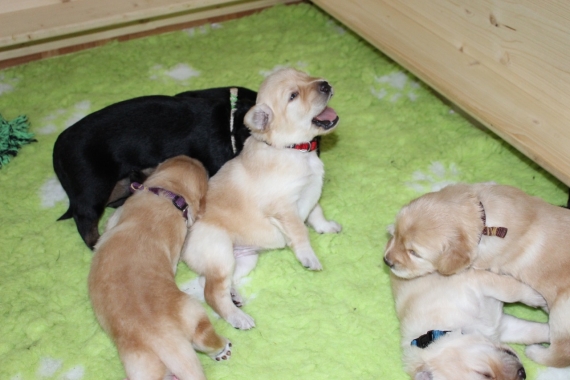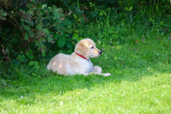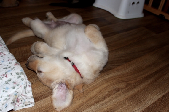 Alma hat sich zu einer stattlichen Welpen-Dame entwickelt; sie wiegt nun 4180 Gramm. Alma sitzt gerne dabei und schaut sich alles an. Besonders genießt sie es, wenn sich daraus eine lange Streichelphase anschließt. Dann dreht sie sich auch gerne auf den Rücken!
